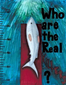 “Humans kill up to 100 million sharks per year, compared to the only 70-100 shark attacks on humans a year with only 4-10 being fatal? In my piece I drew a shark that has been kept alive, finned, and tossed back into the water, now slowly sinking to the bottom to starve. Behind the shark is a graph showing the decrease in shark population numbers because of harmful finning practices. Bold black letters state “Who are the real killers?” Many people see sharks as the killers but in reality, it is the sharks’ blood in the water not humans. I hope that my piece will bring awareness to how common, brutal, and inhumane is the practice of shark finning.”