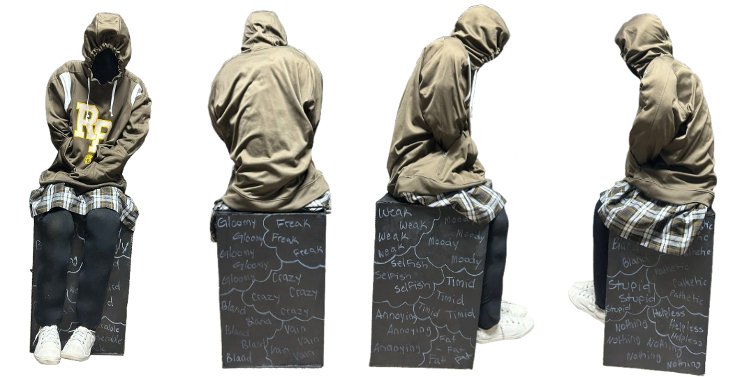 “My project shows how mental health can be invisible. Since it looks human, she has a name, Evangeline. Evangeline is dressed in a Roger Bacon skirt and sweater, while her face is blank. She is sitting on a black box with negativity written on it. I started with wood-pieces; measuring and screwing them together. Once the armature was constructed, the shoulders looked too large, but I ignored it. I filled the leggings with foam and went to the shoulders; putting the sweater on, I was shocked. I neglected the shoulders, and now it looked wrong. I was embarrassed, the problem I’d ignored had finally come back to bite me. But luckily, a teacher helped me fix it. My goal was to show how mental health can be so intense yet hidden. When people passed Evangeline, they thought she was real, but none acknowledged her lack of face. That sentiment encapsulates what I’m expressing. When someone struggles with mental health, everyone just sees a person, and not an actual human who’s struggling. My goal was to show that anyone could be in her shoes, which is why I put her in average clothes, the person beside you could be hurting too.”