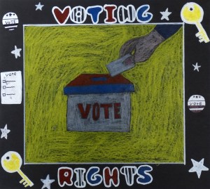 “Having learned about the graffiti style artwork of Keith Haring, and under the guidance of art teacher Steve Groh, students created a drawing in a similar style using symbolic imagery to communicate a message based on a social issue.”