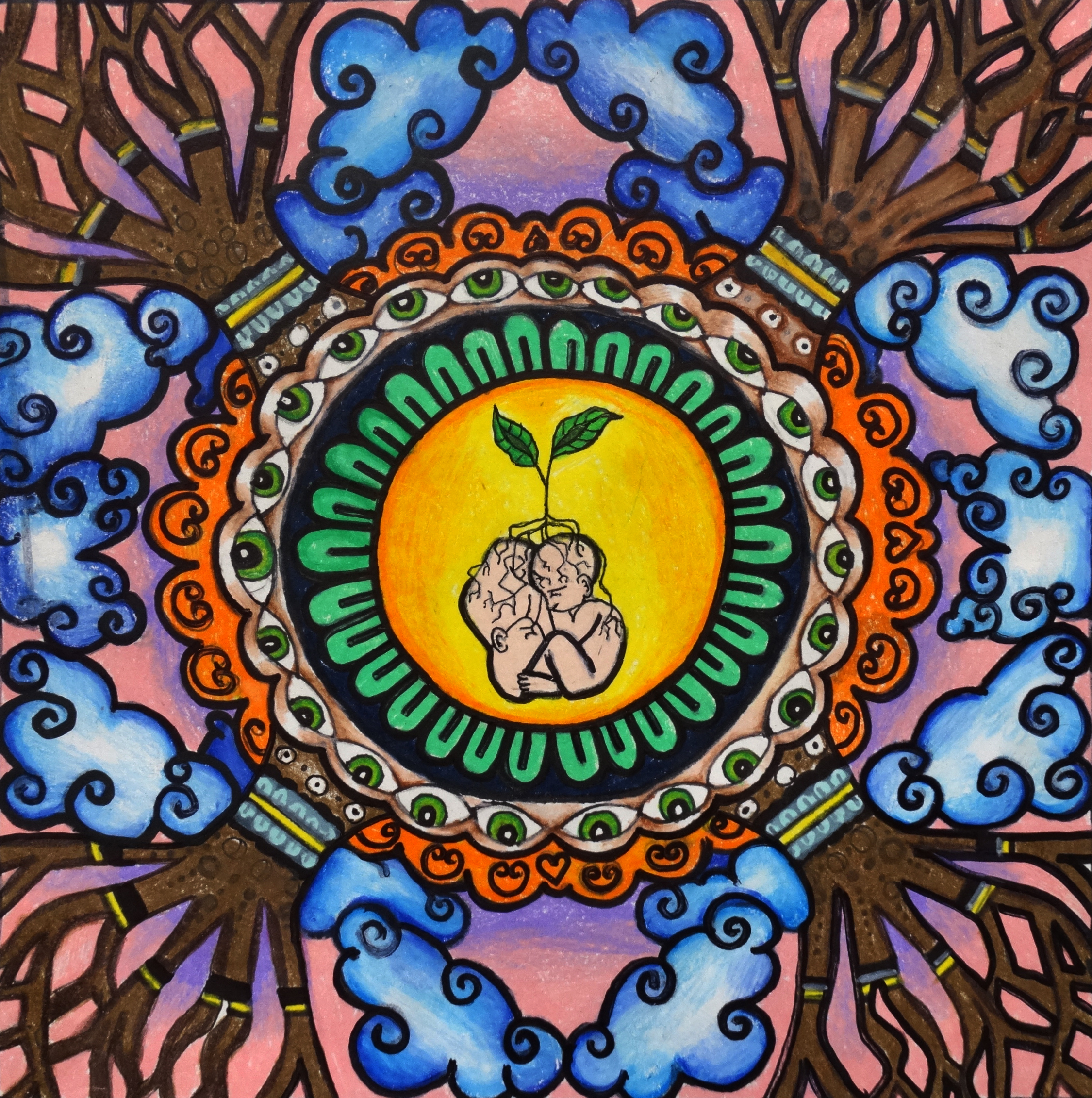 “Under the guidance of art teacher Jamie Schorsch, students explored the art of Mandalas, inspired by Indian traditions, to design a radially balanced composition using a variety of lines, shapes, colors, and patterns. The final compositions communicated visually what they interpreted as one of their core values.”