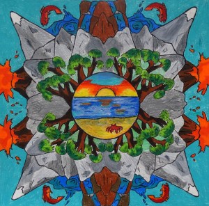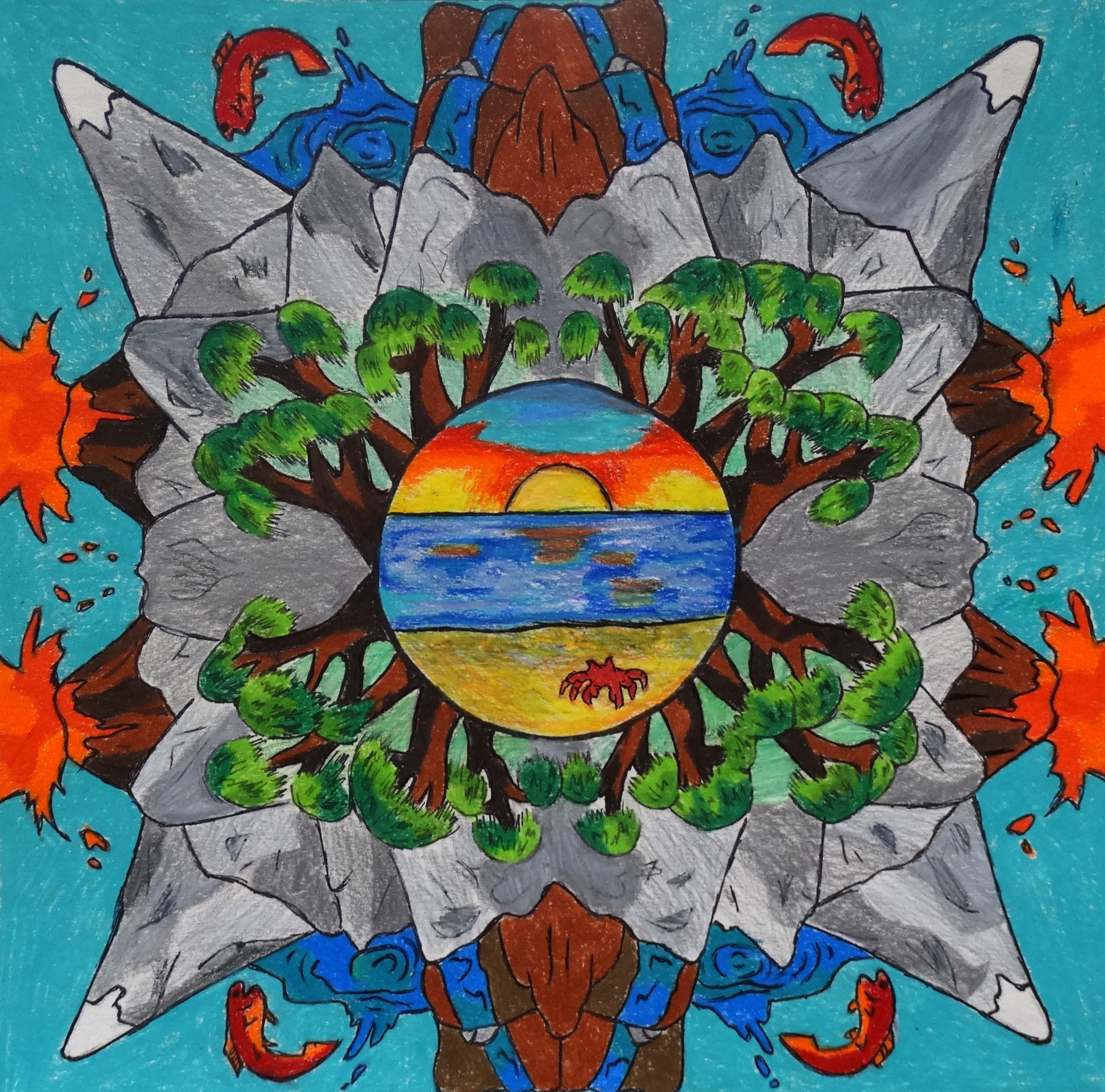 “Under the guidance of art teacher Jamie Schorsch, students explored the art of Mandalas, inspired by Indian traditions, to design a radially balanced composition using a variety of lines, shapes, colors, and patterns. The final compositions communicated visually what they interpreted as one of their core values.”