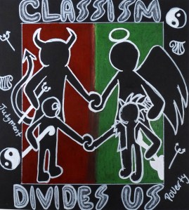 “Having learned about the graffiti style artwork of Keith Haring, and under the guidance of art teacher Steve Groh, students created a drawing in a similar style using symbolic imagery to communicate a message based on a social issue.”