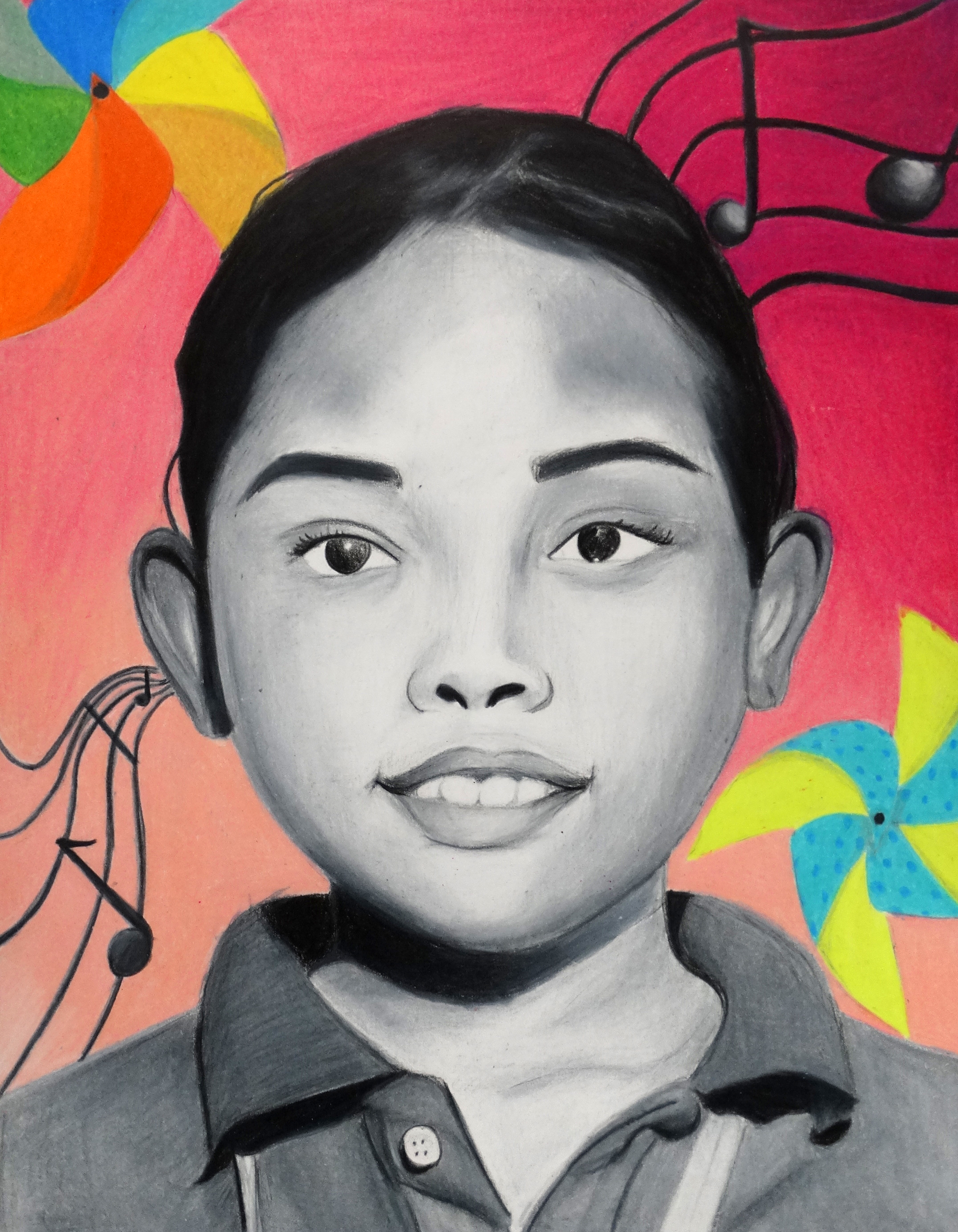 “Invited by The Memory Project, a nonprofit organization, and under the guidance of art teacher Jamie Schorsch, students created portraits for youth around the world who have faced substantial challenges, such as neglect, abuse, loss of parents, and extreme poverty. Completed portraits are sent to the students in their home countries.”