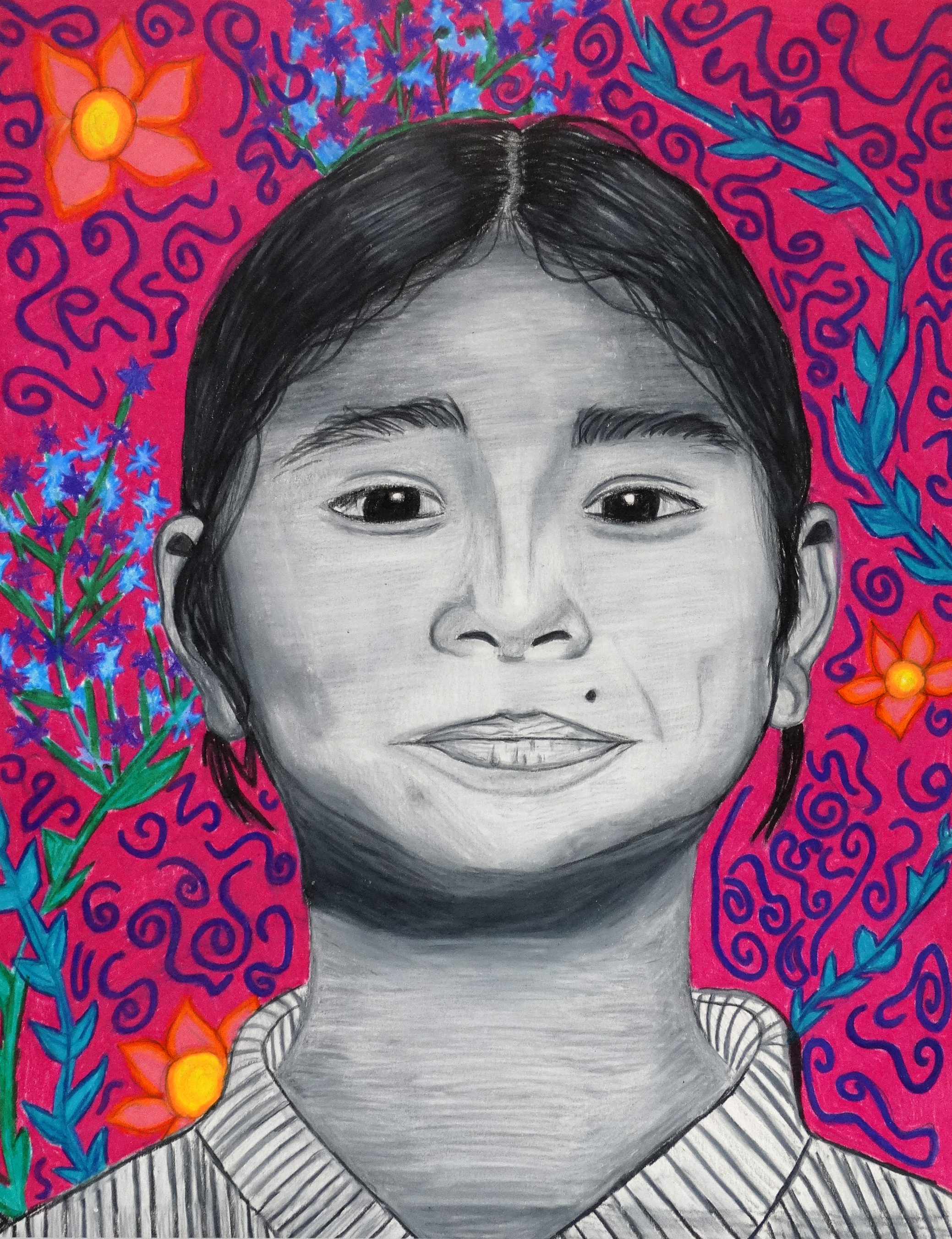 “Invited by The Memory Project, a nonprofit organization, and under the guidance of art teacher Jamie Schorsch, students created portraits for youth around the world who have faced substantial challenges, such as neglect, abuse, loss of parents, and extreme poverty. Completed portraits are sent to the students in their home countries.”