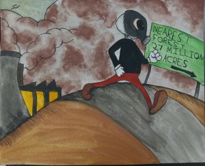 “We’re losing our air, and we need to act now. My piece is about pollution and global warming, In it, a 1950’s cartoon style character with a skull head and neck, wears a gas mask. Through the gas mask eye hole, human skin can be seen. In the background factories pumping out more smog for the air are shown, also a sign that says “nearest forest 27 million acres” symbolizing how 27 million acres of forest are cut yearly. But behind the smog one can see a sky with birds flying to show that there still is hope to heal.”