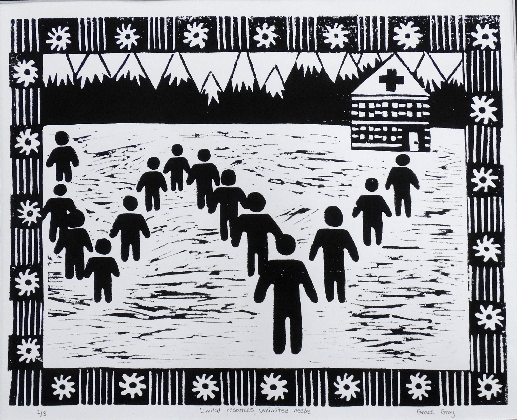 “This print encourages viewers to reflect on the privileges they often overlook,particularly access to healthcare. Limited Resources, Unlimited Need highlights the extremely limited medical care available in Sierra Leone, a reality that feels especially significant to me because it affects children and teenagers my age. With a strong interest in the medical field, I believe it is vital that developing countries have adequate healthcare resources. This issue is universally relevant, as people can empathize with those their own age who lack basic care. In the piece, numerous silhouettes symbolize the overwhelming number of people in need, contrasted with a small, under‑resourced health center unable to meet demand. This visual disparity emphasizes the severity of the crisis. Ultimately, the artwork challenges viewers to acknowledge the healthcare access they may take for granted and to consider those who can only dream of such support.”