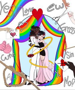 “Support for same-sex marriage increased significantly in the past decade, reaching a near-record high of about 68% in 2025. However, The Economist/YouGov’s 2025 annual poll surveyed 1,623 adult U.S. citizens between October 24 and October 27, 2025. When asked if they think same-sex marriage should be legal, 54% said yes, 33% said no, and 13% were unsure. These numbers mark a considerable drop from just a few years ago, when Gallup’s 2021 poll found that a record-high 70% of Americans supported same-sex marriage. My piece shows two women getting married, their rings floating around them, and a war of agreement and disagreement on either side.”