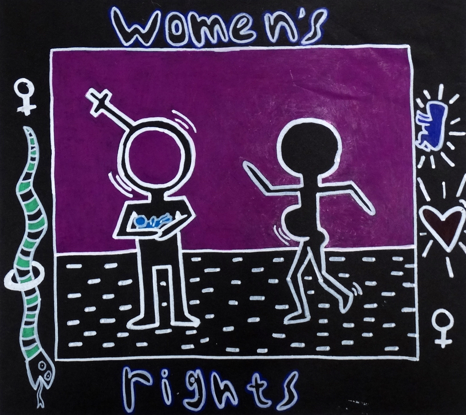 “Having learned about the graffiti style artwork of Keith Haring, and under the guidance of art teacher Steve Groh, students created a drawing in a similar style using symbolic imagery to communicate a message based on a social issue.”