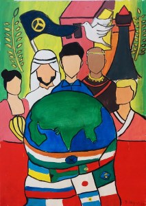 “I painted this picture to highlight two important values: peace and equality. Both are essential for all human beings living in the world. In the artwork, I have depicted the flag and headquarters of the United Nations because the UN plays a vital role in maintaining peace among nations and fostering friendship between countries. I have also painted people from different countries to represent peace with equality. Although our cultures differ and we live in different nations, we are all human beings. Peace with equality is essential for everyone, and that is the message I aim to convey through this painting.”