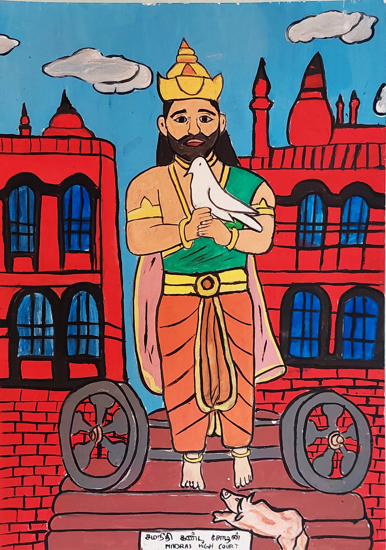 “I have painted a realistic image of the Madras High Court statue. In reality, the statue holds a book of laws in its hands, but in my painting, I have replaced the law book with a dove. The dove symbolises peace and justice, which are the core values of Tamil Nadu. The statue itself represents the idea that no one is above the law and that all people are equal before it. The image is associated with the legendary king Manu Needhi Cholan, who is remembered for his commitment to justice. By portraying him holding a dove, my artwork conveys that both justice and peace are equally important for our society.”