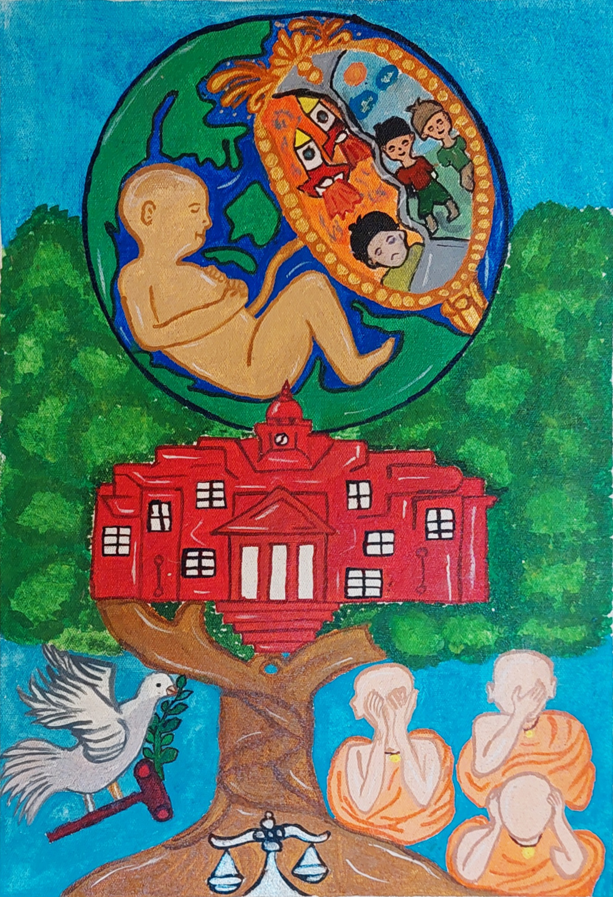 “My drawing shows how the world might appear to children who are born into it, as every child is born with hope and expectation but does not know the reality of the world. Through a mirror, I reveal this reality to the child. From the top of a tree, everything can be seen clearly, and the tree itself stands without discrimination, offering fruits, shade, and peace equally to all. In the same way, justice must be given to everyone without bias, because peace can exist only where justice is present. The dove holding a hidden knife symbolises that peace needs justice for protection. We should not blindly believe what we see, hear, or say, as only proper inquiry leads to truth. The three human figures in white, green, and blue represent a heaven that is pure, peaceful, and harmonious.”