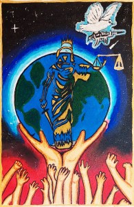 “Many people in the world live with anger, fight with others, and fail to follow justice. Through this artwork, I convey the message that by practicing peace and upholding justice, we can lead a better life. Lack of peace causes harm to others, and many nations engage in wars without considering the welfare of their people. This drawing shows that peace can be achieved only through justice. I have depicted Lady Justice to represent fairness, a bird carrying a gun away from the world to symbolize disarmament, and a hand to show that people support and stand for justice.”
