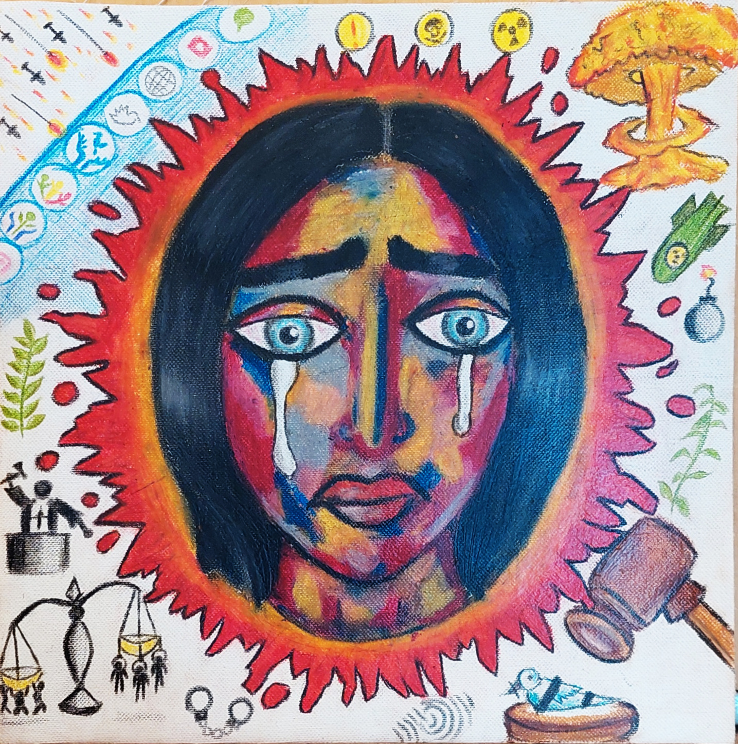 “In this artwork, I interpret justice as a response to injustice, inequality, and the loss of peace. In the present world, people face many serious issues such as war, injustice, the threat of nuclear conflict, and the harassment of women. These problems deeply affect global peace. However, many international peace organisations, NGOs, and especially social media play an important role in creating awareness and protecting the world by promoting justice. The central theme of this artwork is that when injustice prevails, peace will ultimately collapse.”