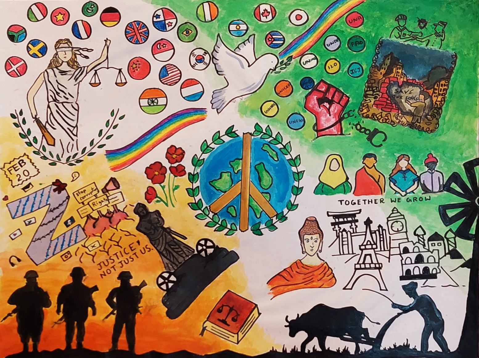 “This artwork represents the balance between justice and peace. Justice is shown on the left, symbolizing fairness and protection, while peace is on the right, represented by a dove, rainbow, and constitutional book. The statue of Manu Needhi Chozan reflects equality for all, and the broken handcuffs show overcoming oppression. The small boy represents those suffering from war and conflict, reminding us that true peace is possible only when justice is upheld, people unite, and humanity grows in harmony with nature.”