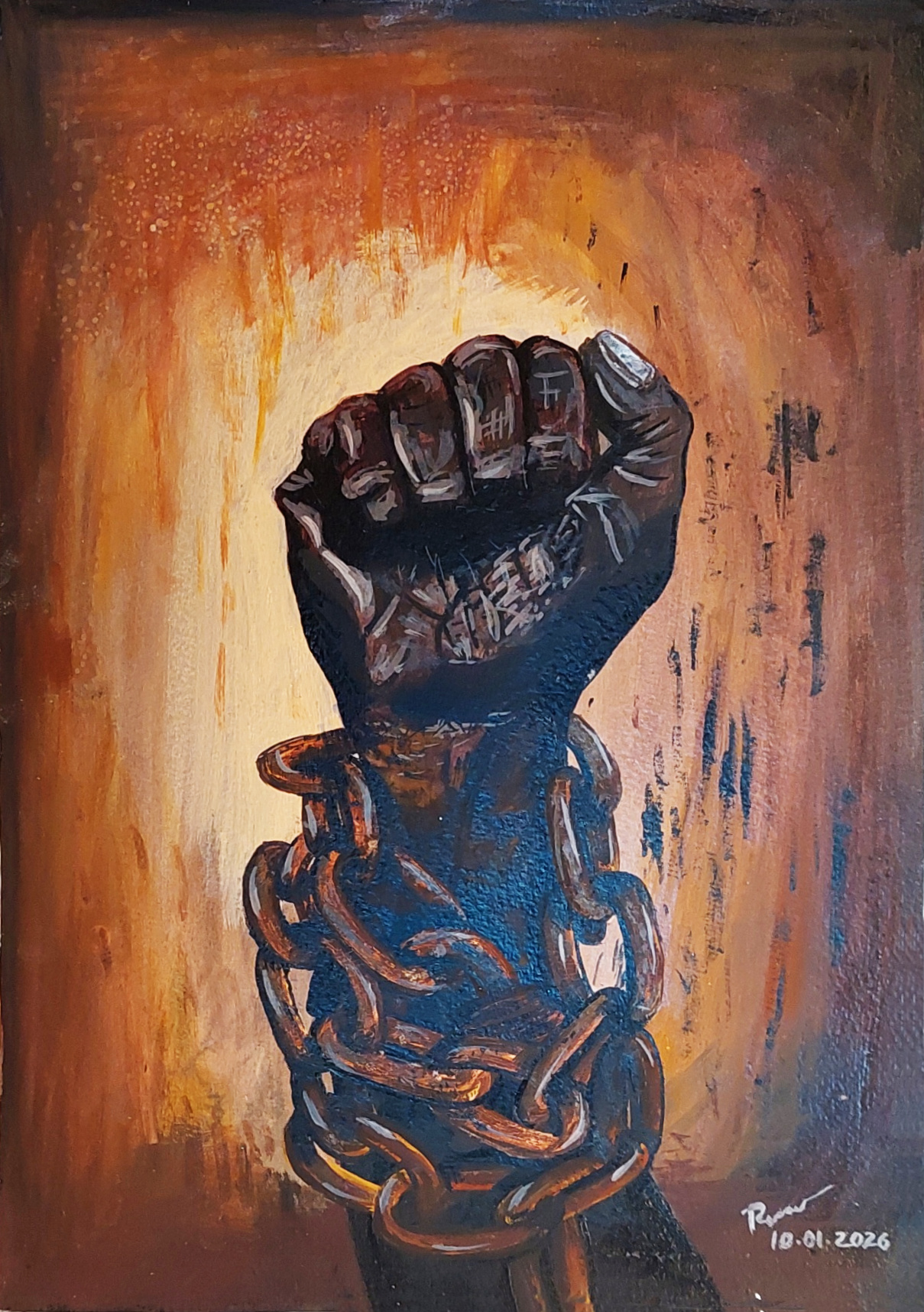 “The rough texture speaks of the way authoritarian forces treat the oppressed. The bright colours make a strong statement about our society. The wounded hands of the enslaved community are still bound by rusty iron chains—hands that reach out for justice with unwavering determination. The justice they receive must stand as strong and unbreakable as those iron chains.”