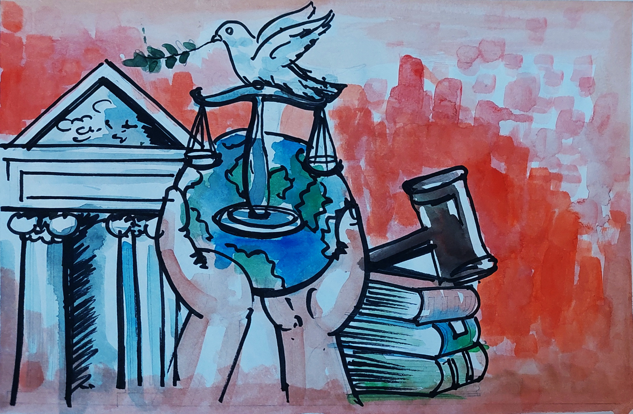 “The artwork represents the connection between justice, peace, and global responsibility. The hands holding the Earth symbolise humanity’s duty to protect the world through fairness and compassion. The balance placed over the globe shows that justice must be equal for all people. The white dove represents peace, harmony, and hope rising above conflict. The courthouse pillars signify the foundation of law and truth, while the books and the gavel stand for knowledge, the Constitution, and the rule of law. Through this artwork, I want to convey that lasting world peace is possible only when justice, wisdom, and humanity work together.”