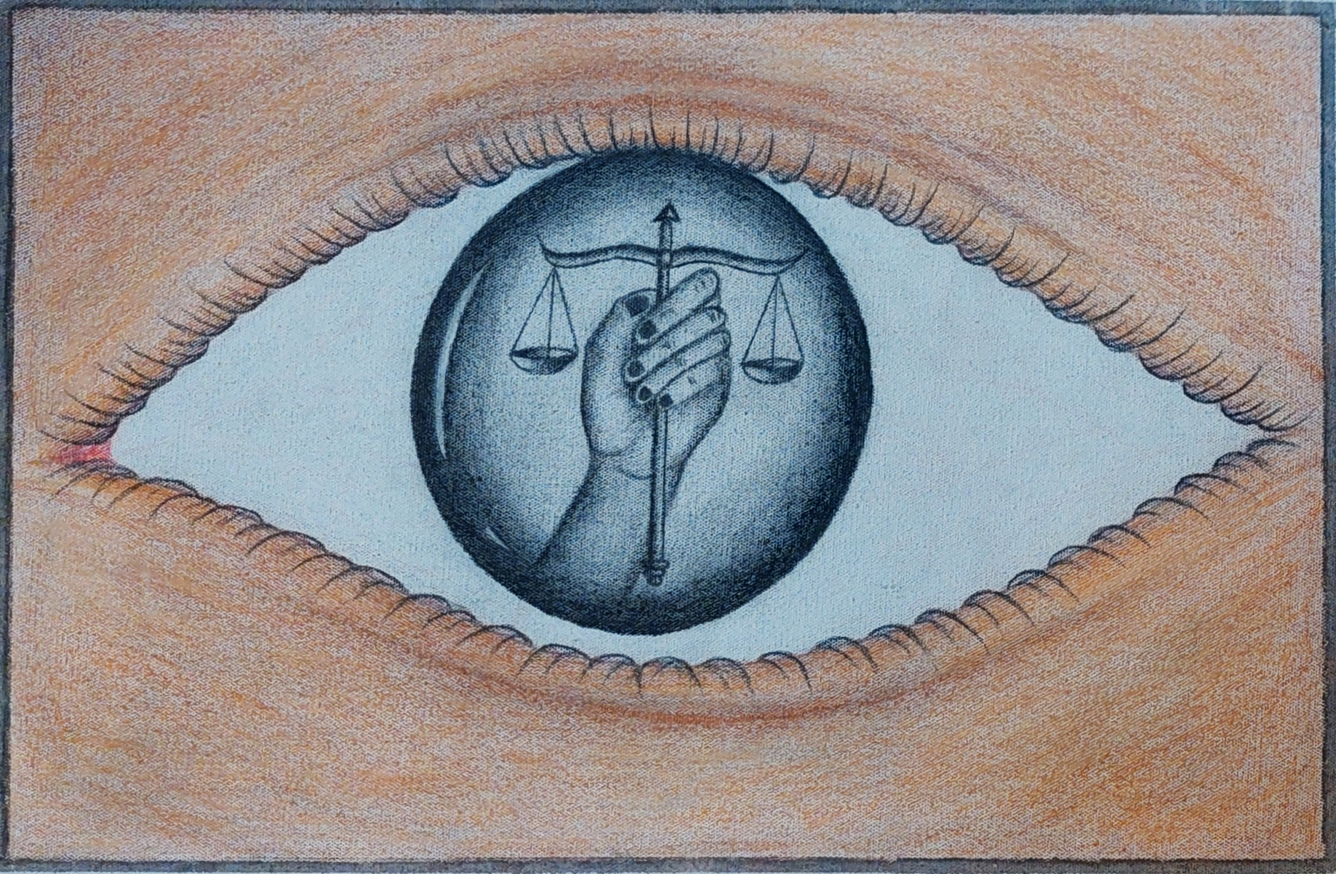 “In this artwork, I convey that justice is like the pupil of the eye—extremely precious and essential. Upholding justice is not the responsibility of judges alone; every individual must practice it for justice to truly prevail. Justice is a noble value, and it leads the way to peace. If we desire peace, we must protect justice just as we protect our eyes with our eyelids and brows. Therefore, justice should be safeguarded carefully and carried within our conscience at all times.”