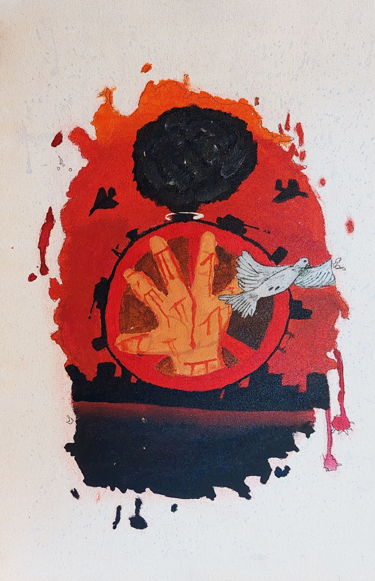 “Through this painting, I wish to convey the idea that peace must be protected. During times of war, the lives of people in a country are destroyed and soaked in blood. We witness how war turns human life into suffering and loss. The people long for a life without war, where they can live freely and peacefully like a dove. With the desire to protect their lives and safeguard peace, they reach out towards the dove, the symbol of peace. This artwork emphasizes that peace is far more valuable than war and that humanity can truly survive only through peace.”