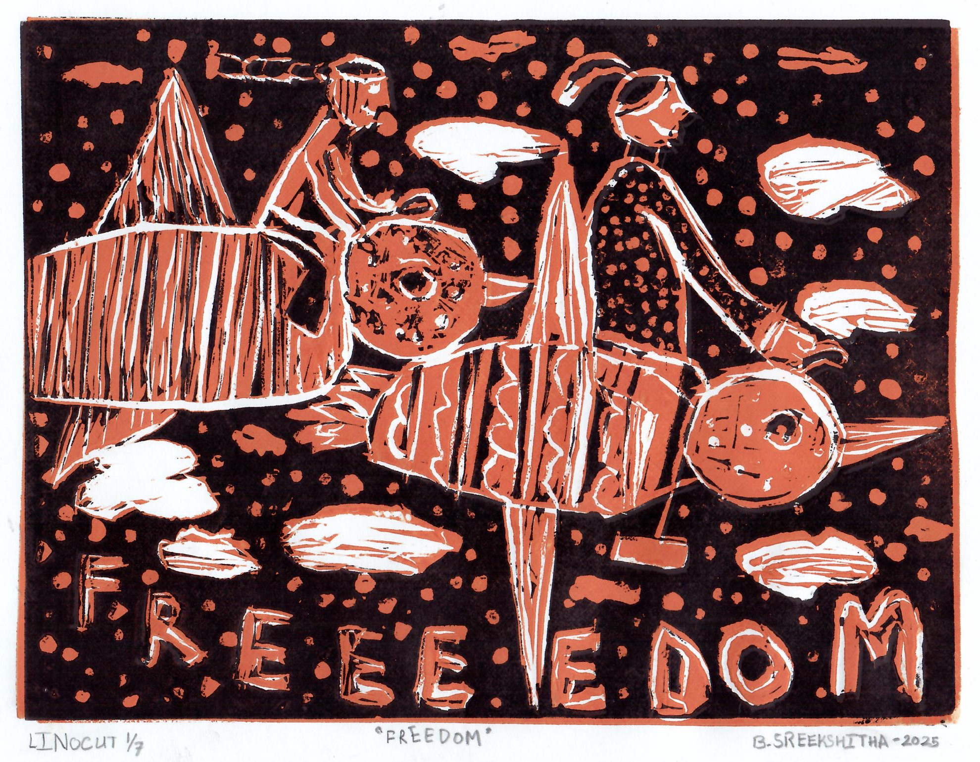 linocut print; 7×9.5”