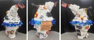 “My piece is a large iceberg decorated with many examples of political corruption ranging from pictures, documents, and words to a riot shield, chains, and the US Constitution. The iceberg represents a view of what the media sees and the difference to what is actually going on. The message is about the media control and erasure of political news to the public and the call for bigger governmental responsibility. The work expresses both a personal and social issue of how there is shared anger amongst the American people over injustices and corrupted ways the government has been handling issues like immigration and scandals.”