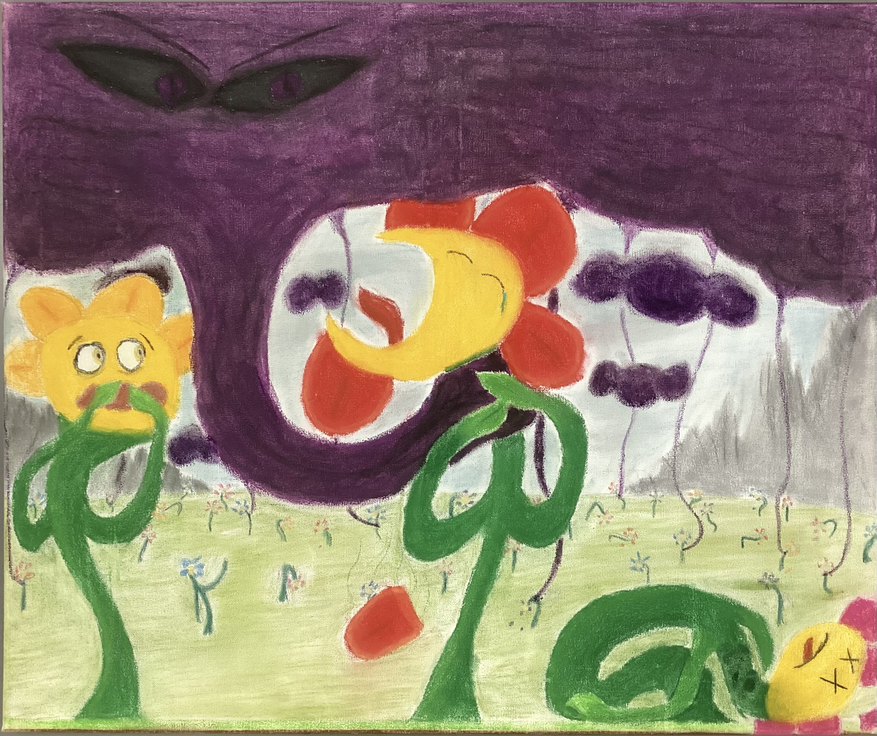 “My artwork is titled Strangling Smog, because I depicted the consequences of human carelessness on nature. My main subjects are three little plants, and I made them human-like so the audience is emotionally engaged. The first flower is being choked by air pollution, with a fearful look on its face. The second flower is watching in horror, and the third one is lying dead on the floor. I aimed to make these three flowers representative of what might happen to humanity if we do nothing or too little to put an end to air pollution. At the top of the canvas is the pollution itself, its eyes showing unrelenting control with its arm. I used three distinct media in an effort to make the subjects stand out from the background and for the smog to be a different texture; oil pastels, chalk pastels, and conté crayons. I tried to capture a cartoonish feel with this artwork. I was partly inspired by political cartoons that show drastic images in order to get an opinion across. My artwork is cartoony because the message is made clearer. Although I made the flowers cartoony, I tried keeping the human emotions on the flowers.”