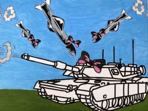 “After studying the street art of Banksy, and undedr the guidance of art teacher Jamie Schorsch, students researched a topic related to one of the 17 United Nations Sustainable Development Goals. Their resulting artworks communicate their viewpoint on a related topic, a moral stance on a particular incident, and thoughts on an aspect that affects their life.”