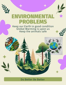 The social justice concept I chose is environmental problems. The images represent what our world would look like if we stay at the rate we’re at. The front and center image represents what our Earth can look like. The left image was chosen to represent the effects of factories like pollution. The right image represents how pollution is also affecting our Earth. My piece promotes empathy because it’s care for our world and our choices.”
