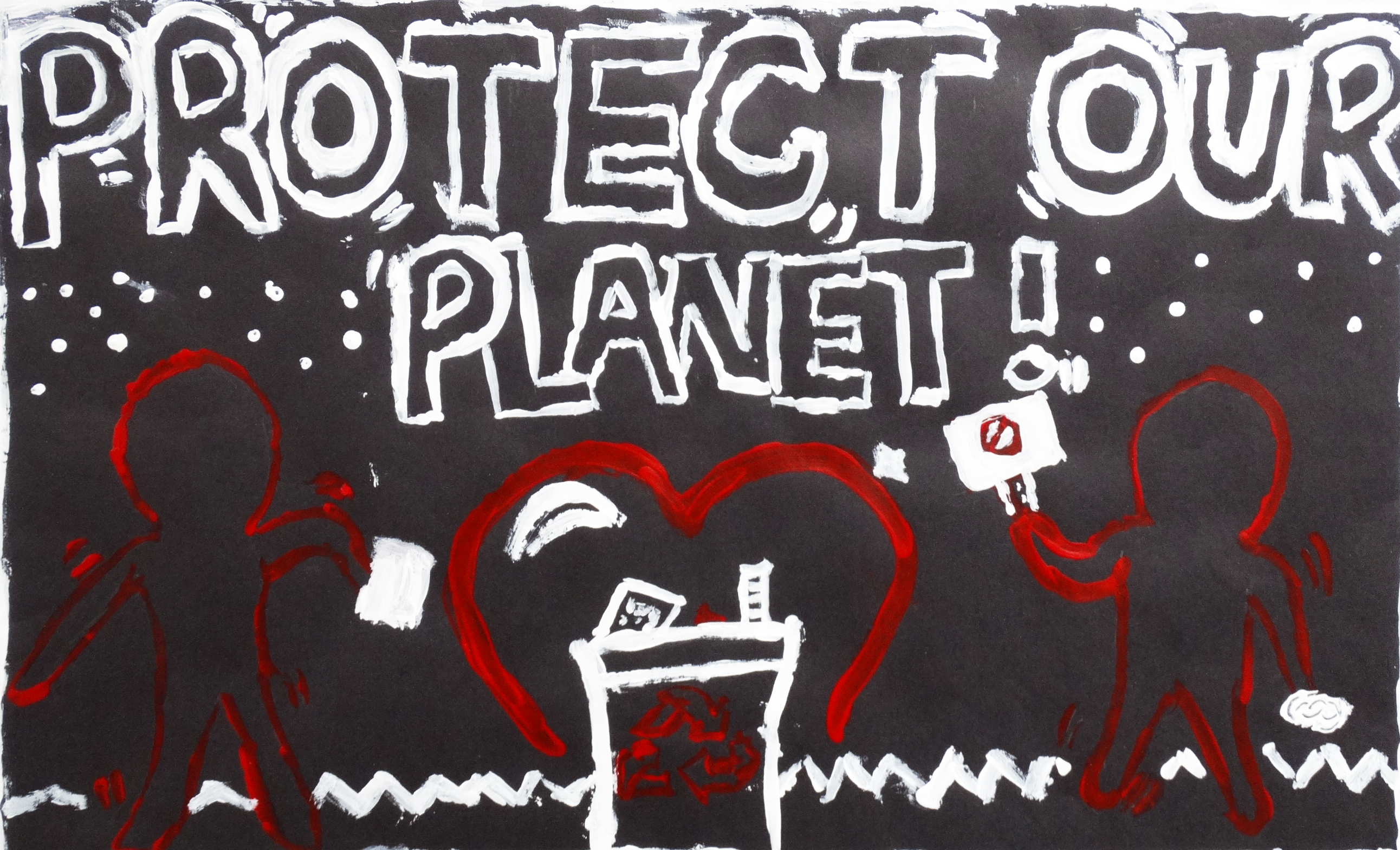 “Under the guidance of art teacher Matt Reed, students at Princeton High School studied the work of Keith Haring, an artist known for using simple cartoons to communicate with the viewer. The students were asked to create something with a positive message or to address a social issue with their art. They used white and red on black to emulate Haring’s subway drawings and some of his paintings. The project gave the students a better understanding of how art can be used as a vehicle for personal or political expression.”