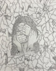 “Have you ever witnessed or been involved in a domestic violence case? This piece is dedicated to all the women and men who have ever experienced such a heinous and awful crime. In my piece, a woman is covered by hands, almost like they are keeping her from speaking. Most of the time when someone is being abused it’s usually from a partner, family member or even a friend. In some cases, people have stalkers who abuse them, maybe not always physically but mentally. Around her is a wallpaper of broken glass. It symbolizes being broken and hurt without having physical wounds. The broken glass also suggests shattered emotions. Domestic violence has affected me in ways I’ll carry with me forever. I’ve seen it and lived through it, and because of that, I understand how terrifying and isolating it can feel. It doesn’t just hurt that one person; it impacts their families, their communities, and the way they learn to trust and feel safe. Speaking up is one of the hardest things to do, especially when you’re scared for your life. I was always afraid to speak up for myself. But staying silent can hurt just as much. People going through abuse should know tthat hey aren’t alone, and that their fear is valid, but so is their strength.”