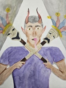 “Do you ever think about religion? Who do you follow, what do the people back in the name of that deity, how do they go about reaching new people? I grew up in a household where one half of the extended family is devout Catholic and the other half is not religious at all. As I grew up I faced judgement from the Catholic side, for wanting to dye my hair, to the music and movies I decided to engage with. My piece is to make people think about how actions are excused, words are used against others in the name of “God”, and how people turn a blind eye to it all. The man in purple shows the “royalty” and power he holds over people, holding the theater masks, jumping from one act to another to either attract or judge those around him in the name of God.”