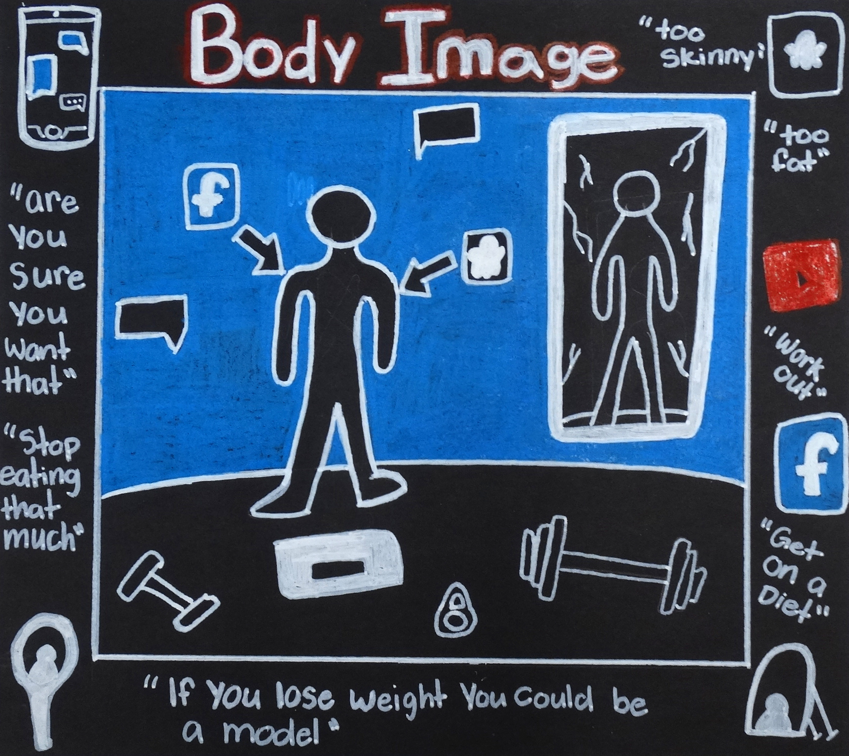 “Having learned about the graffiti style artwork of Keith Haring, and under the guidance of art teacher Steve Groh, students created a drawing in a similar style using symbolic imagery to communicate a message based on a social issue.”