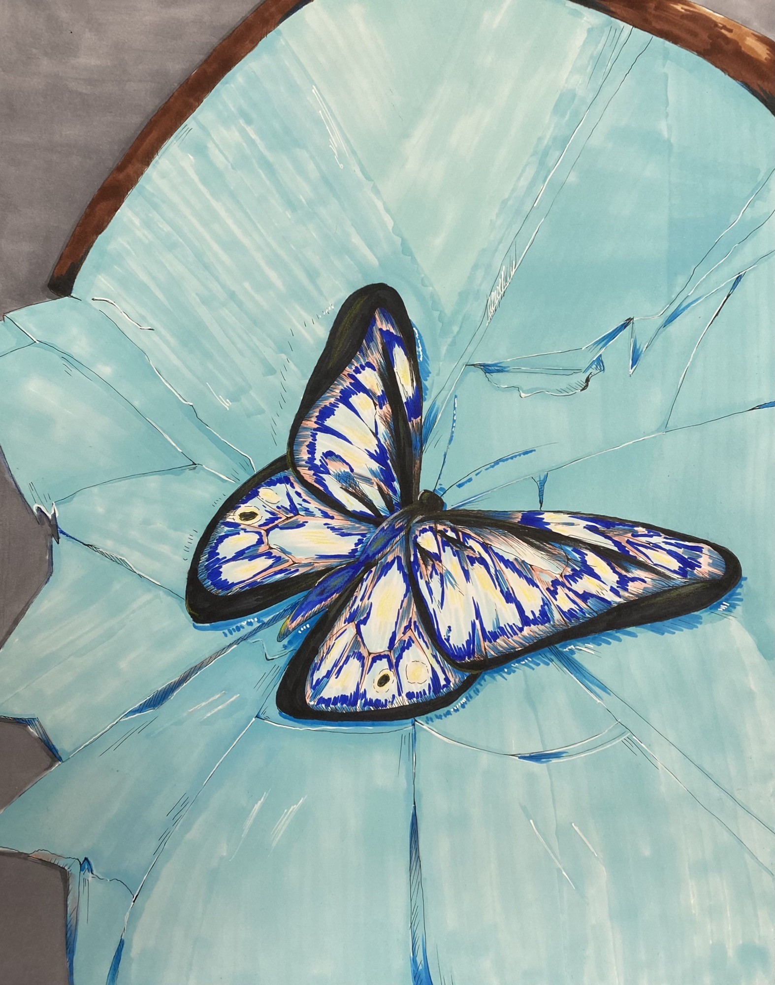 “What would you do if your body didn’t feel like your own? That’s how many transgender people feel throughout their lives. Their body is wrong, not their own, meant for someone else that is not them. My piece features a butterfly that has sat on a broken mirror, its reflection barely visible and blurry. The butterfly’s wings are the typical pink, blue, and white found on the transgender flag. Like transgender people, the butterfly is stuck staring in the mirror wondering “Is this who I am?”. The mirror represents the shattered sense of self transgender people have without proper affirming care. Care that is being slowly taken from them as the political climate worsens. Without gender affirming care, transgender people are left with feelings of gender dysphoria and depression which can be very harmful down the road. Gender affirming care such as testosterone, estrogen, or surgeries, are part of healthcare that shouldn’t be stripped from those who need it. Affirming care should be available to everyone.”