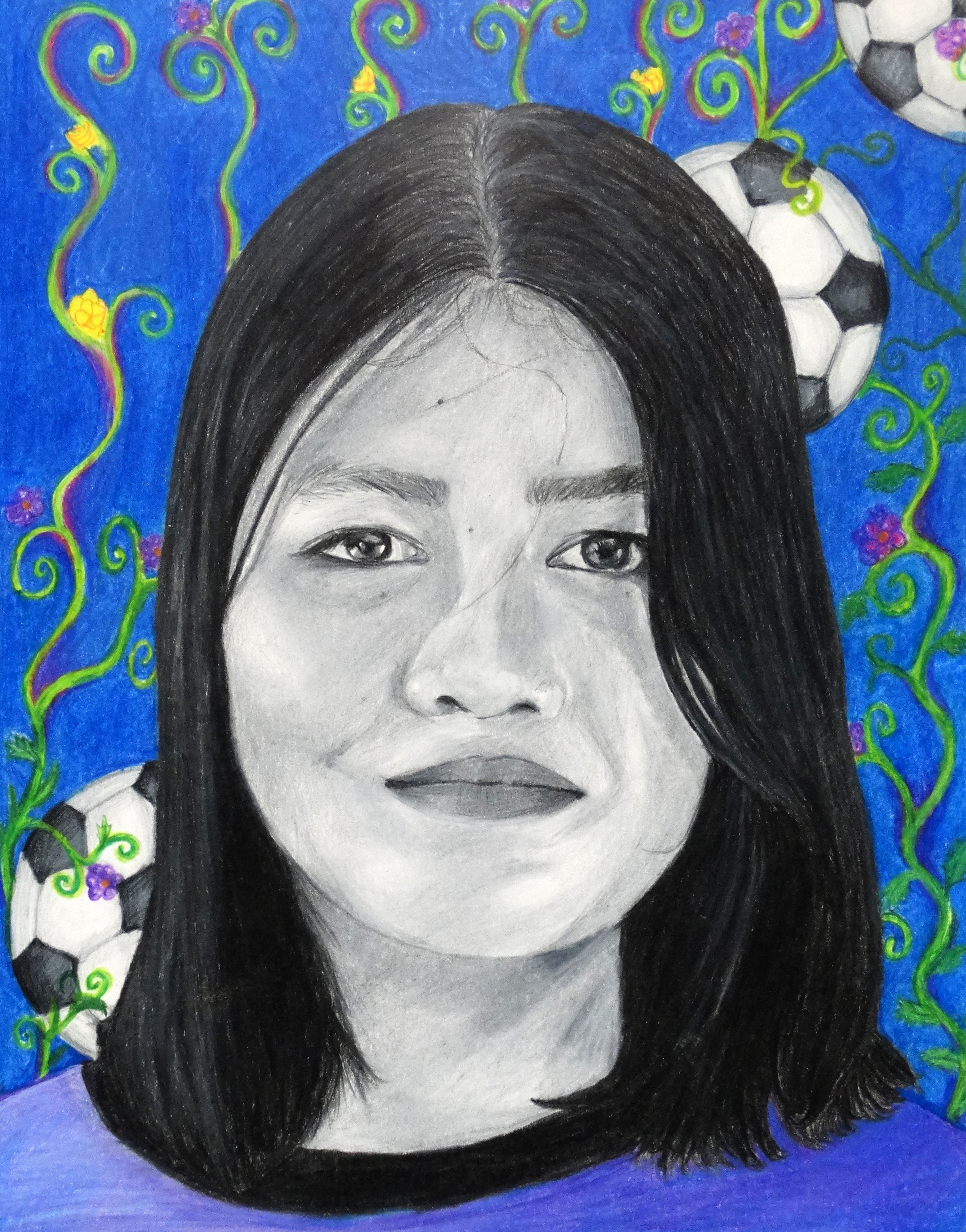 “Invited by The Memory Project, a nonprofit organization, and under the guidance of art teacher Jamie Schorsch, students created portraits for youth around the world who have faced substantial challenges, such as neglect, abuse, loss of parents, and extreme poverty. Completed portraits are sent to the students in their home countries.”