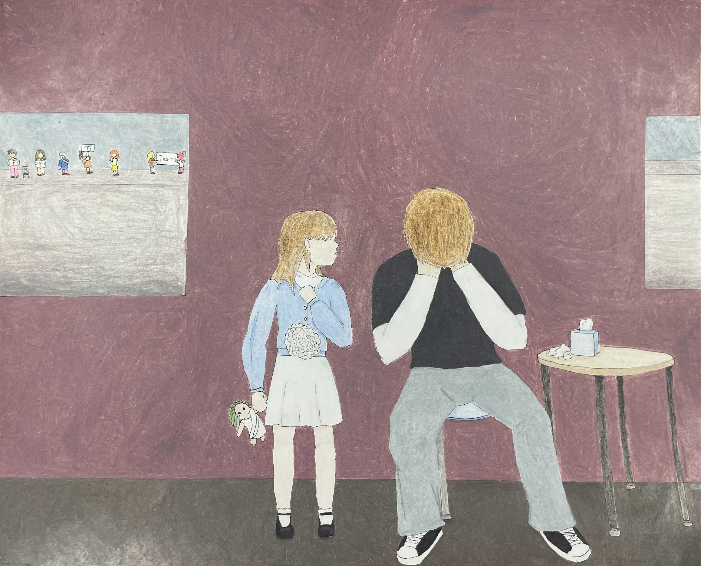“The pro-life movement didn’t start because the people thought the right to choose was murder; it started because the fledgling American Medical Association, an Association that purposefully excluded women and black people from joining, didn’t like how the women were making good money on jobs in what was classified at the time as women’s work; the Association saw it as competition. Hence, they started writing and making a campaign to ban the right to choose, and it was successful. My imagery is a young girl and her older brother at Planned Parenthood, inspired by a story of a worker who said her youngest patient was only 10 years old. A white wilting flowers is coming from the young girl’s stomach, white symbolizing her innocence wilting away. She is holding a medusa doll to represent the same meaning as the medusa tattoo. No one should dictate what you can or cannot do with your own body, especially something as traumatic as pregnancy. Looking ahead, envision a world where individuals have the right to decide what happens to their bodies.”