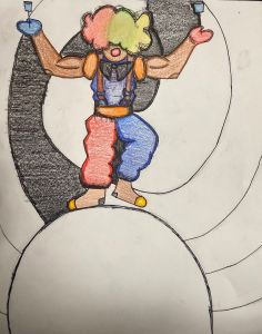 “Many people undermine ADHD. Some claim it doesn’t exist, while others claim people with ADHD simply need to “try harder”. My piece tells what goes on in my head as someone with ADHD. In it a clown is balancing atop a ball with various balancing instruments in each hand. This is what it feels like inside my head. The spiral in the background represents how colorful I am as a person, while the world around me is dull and mundane. Not everyone has the same brain, ADHD or not, so this isn’t an accurate representation of everybody, but it is a representation of me.”