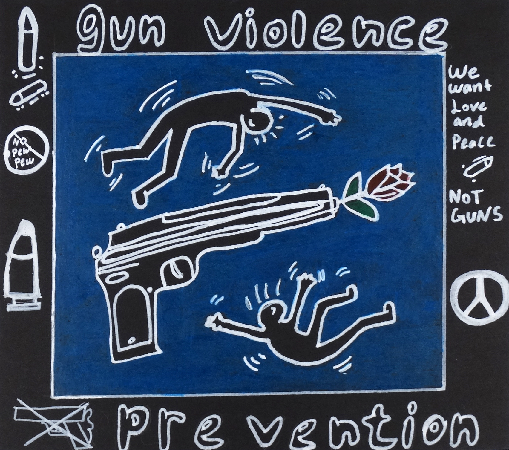 “Having learned about the graffiti style artwork of Keith Haring, and under the guidance of art teacher Steve Groh, students created a drawing in a similar style using symbolic imagery to communicate a message based on a social issue.”