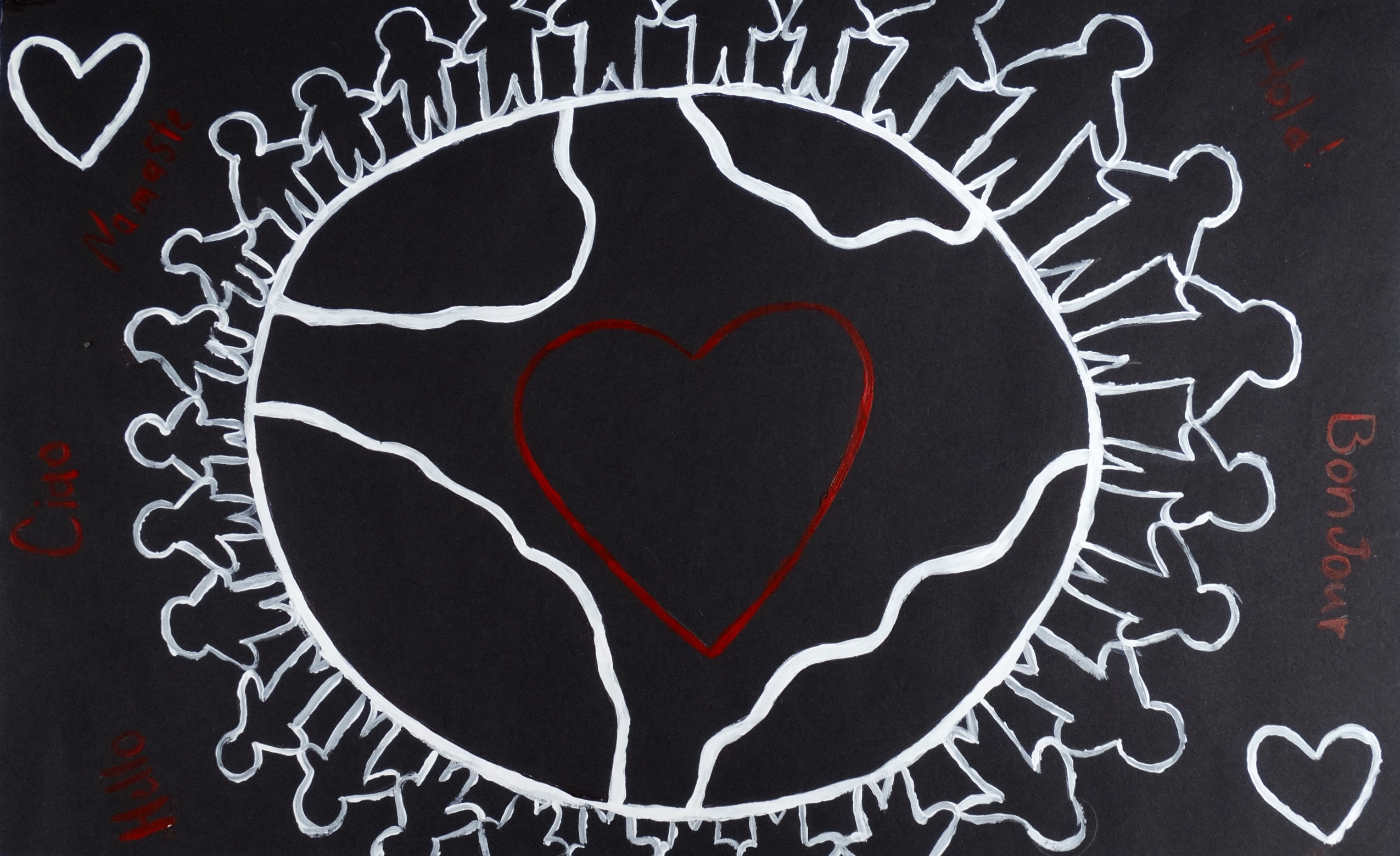 white and red acrylic paint on black paper; 12×18”