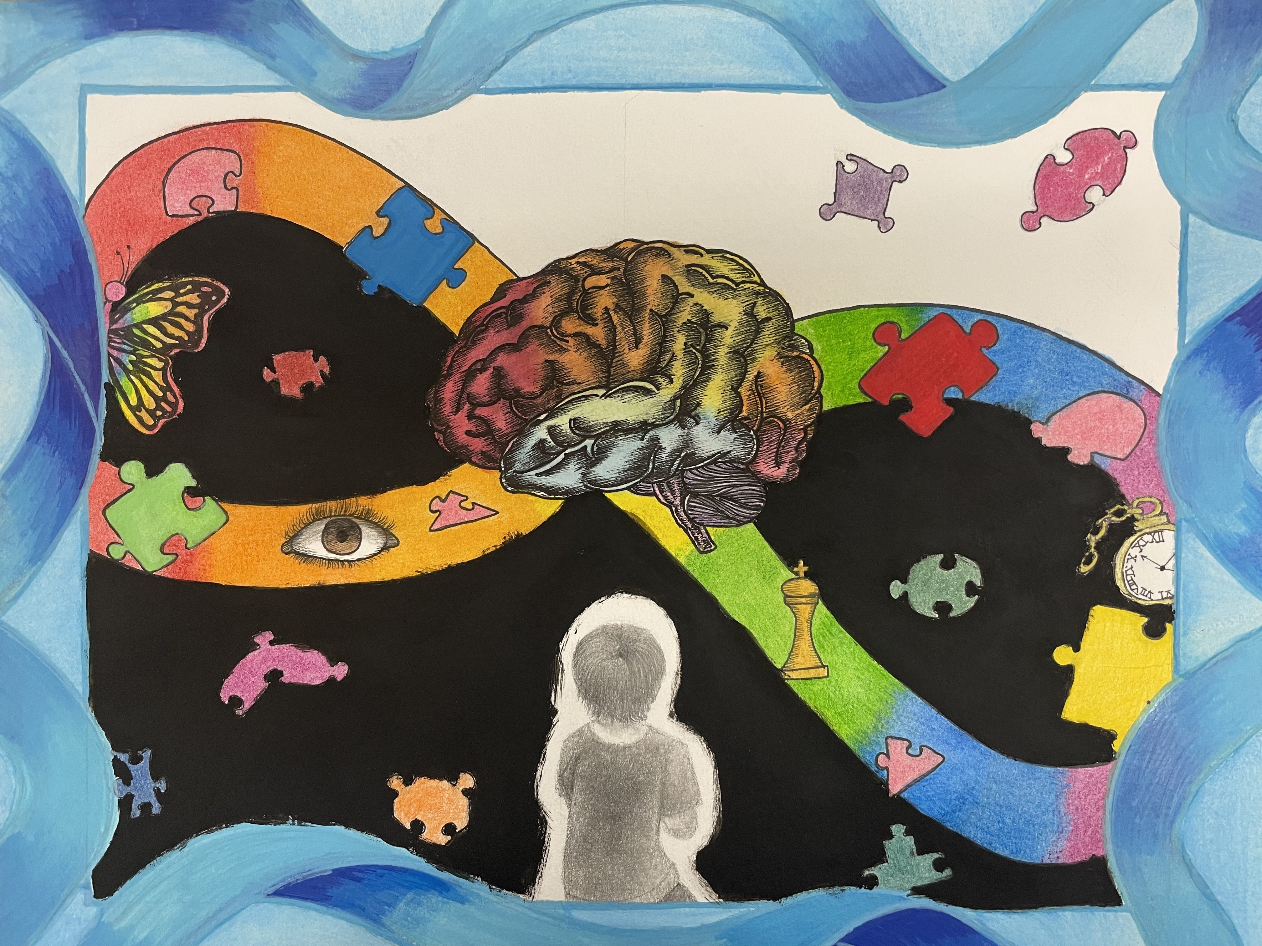 “Have you ever felt like you don’t understand your loved one? My artwork is about Autism. The little boy in the middle is my little brother recently diagnosed with Autism. In the center is a brain. There is also a giant infinity sign representing the symbol for Autism.”