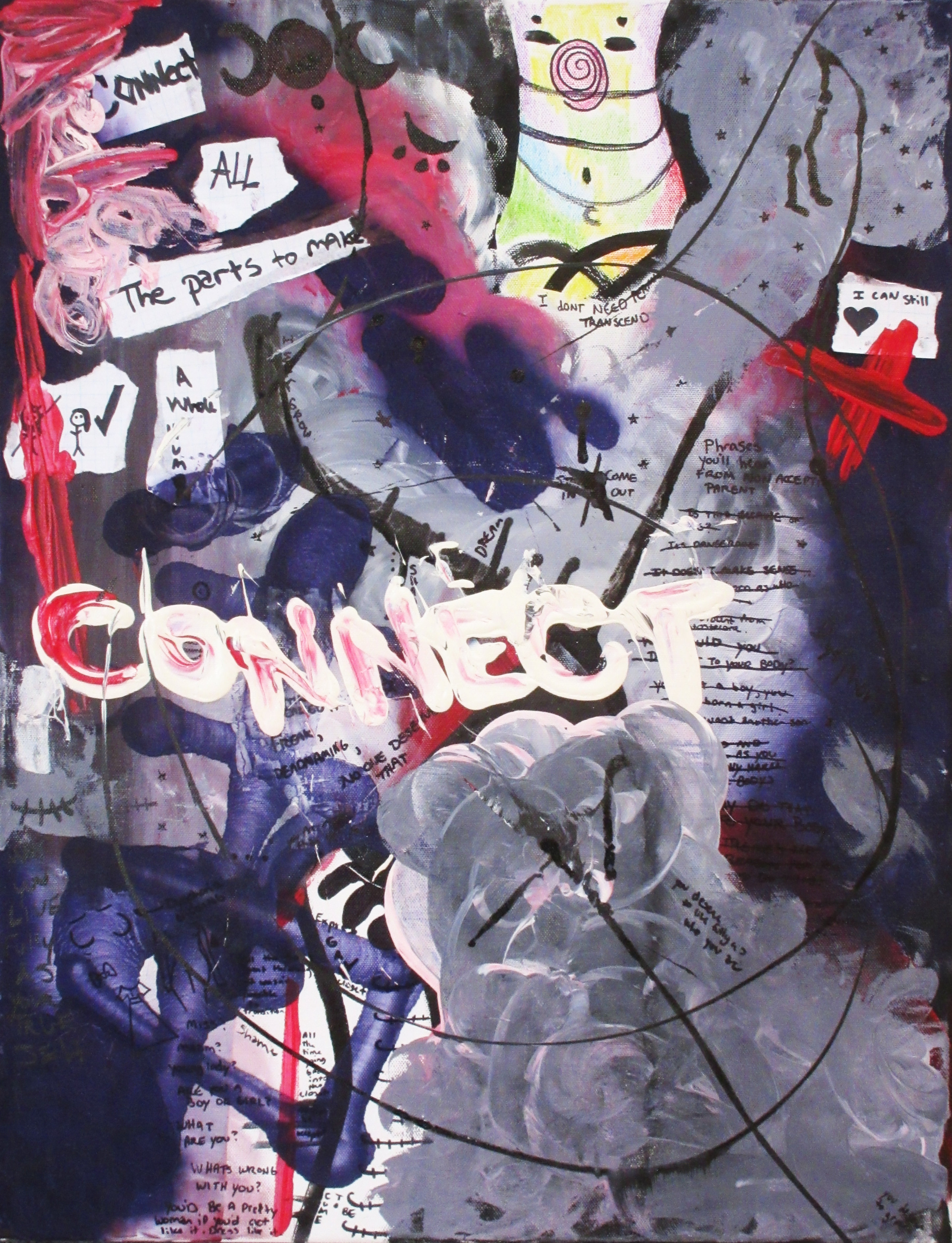acrylic, ink, pastels, chalk, charcoal; 24×18”