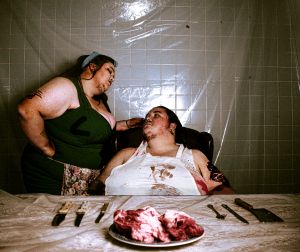 “Within my work, I talk about the general processing of the body, specifically in reference to the body being a piece of meat. My current stage of transition is in a heavily nonbinary space. I have a very femme presenting frame, but my demeanor and certain exceptional sex characteristic are inherently masculine. I am in a state of flux and exist in both sectors of the gender binary. Within this photo series, I approach my relationship with myself, who I am, and how I respond to being present in my skin.”