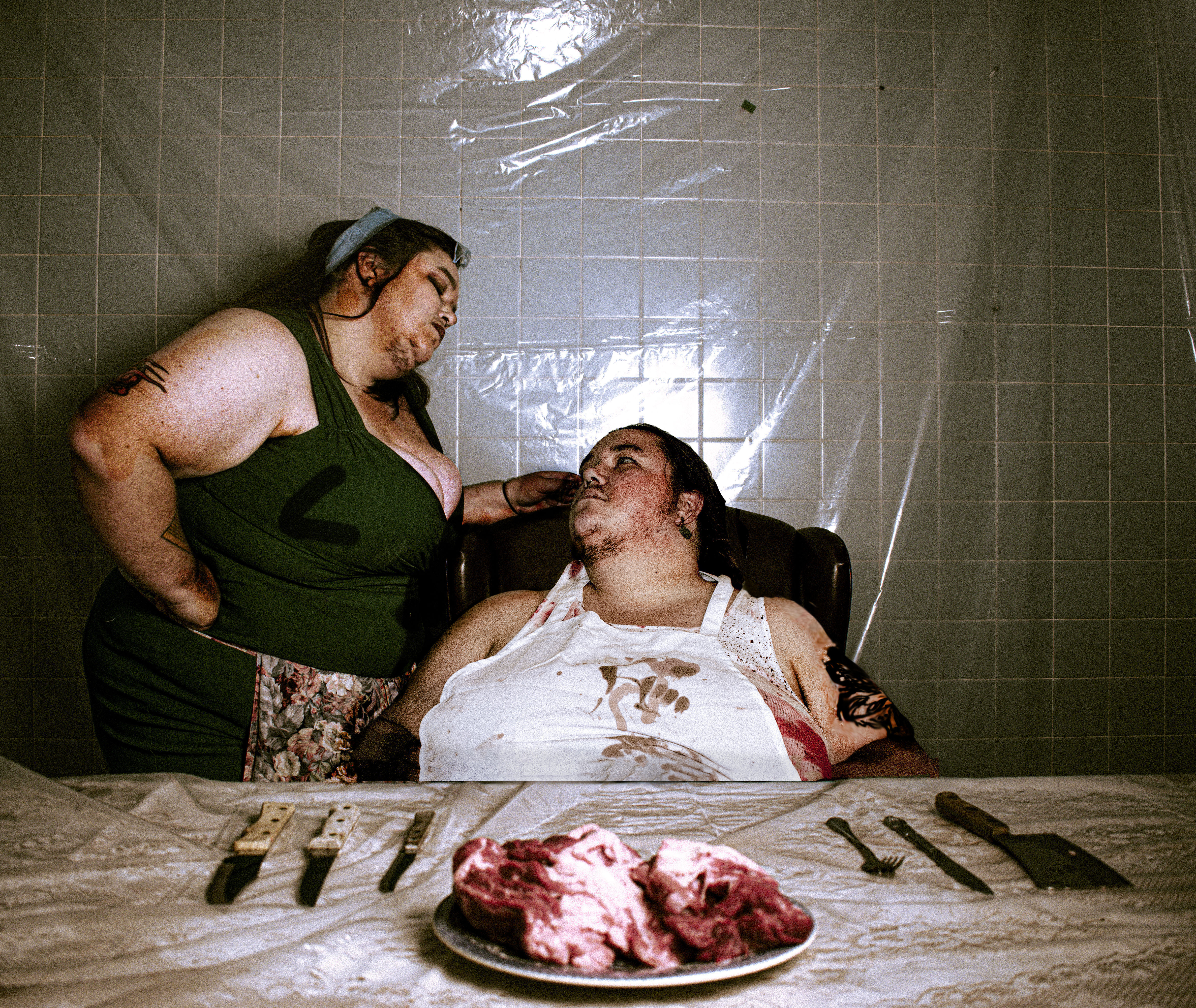 “Within my work, I talk about the general processing of the body, specifically in reference to the body being a piece of meat. My current stage of transition is in a heavily nonbinary space. I have a very femme presenting frame, but my demeanor and certain exceptional sex characteristic are inherently masculine. I am in a state of flux and exist in both sectors of the gender binary. Within this photo series, I approach my relationship with myself, who I am, and how I respond to being present in my skin.”