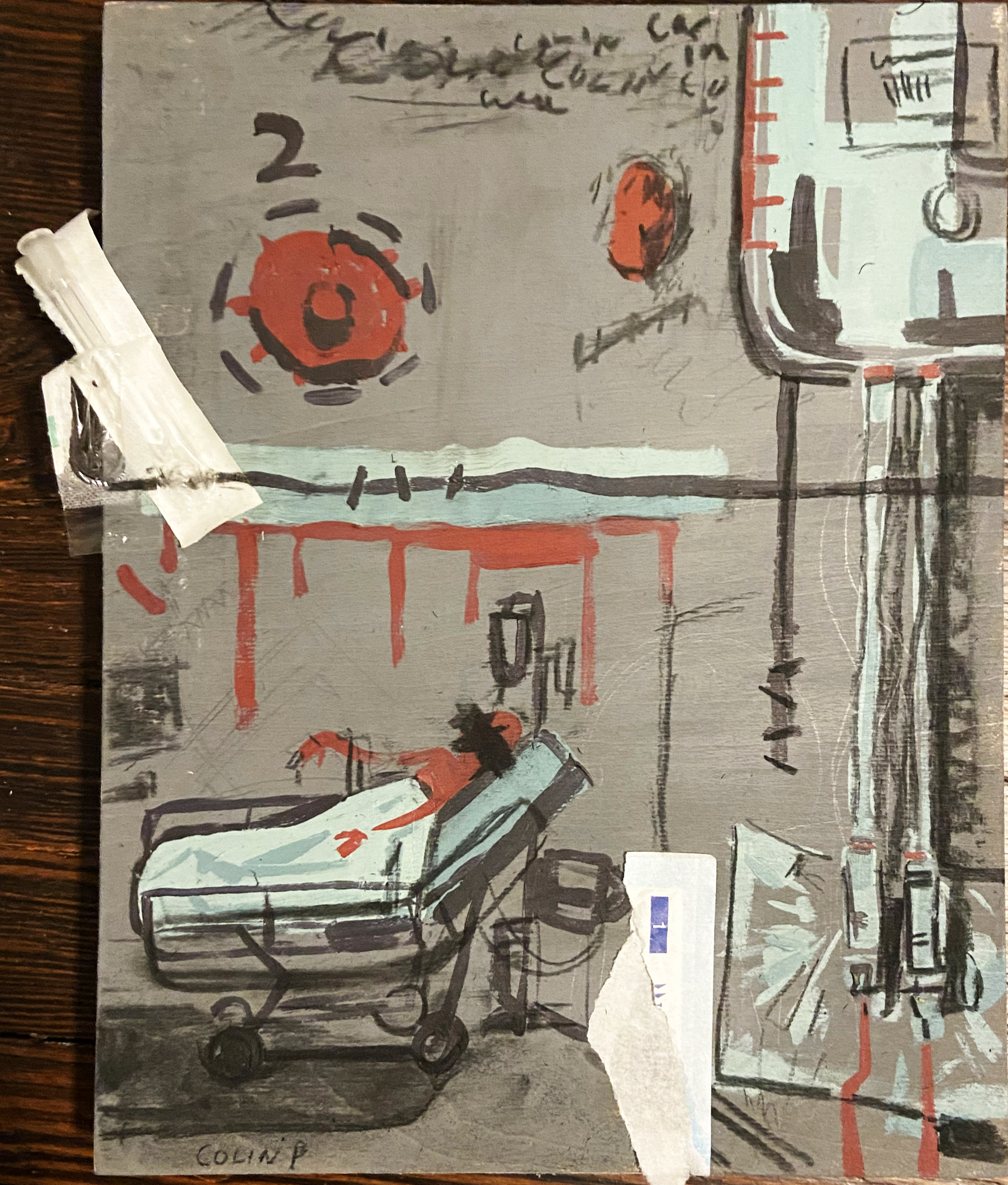 acrylic paint, charcoal, and mixed media (medical supplies as relief) on wood panel; 10×8″