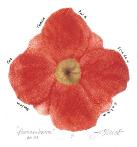 “The poppy is a symbol of peace, especially after WWI. It is meant to remember those who have died in war. Red is the bloodshed; dark center is for those who mourn loved one who will not be welcomed home. In today’s world, there are many who will not return home due to war, hatred, greed… leaving those left behind to mourn and remember.”