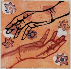 “This little print was made by printing the same hand image, vertically flipped – so that now, the hands relate and interact with one another. I did this to express the continuity of human interaction; the cyclical nature of community; the many in the one, and the one in the many.”