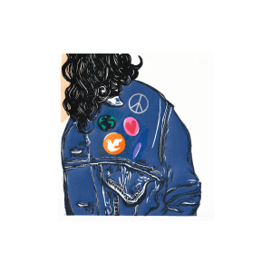 “I was inspired by the way people express their beliefs through fashion. The subject wears an old jean jacket with a peace sign pin, earth, heart, and dove button.”