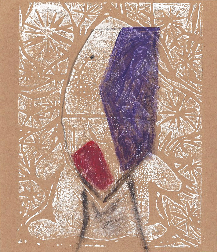 linocut and mixed media; 10×10′, image 4×3.5″