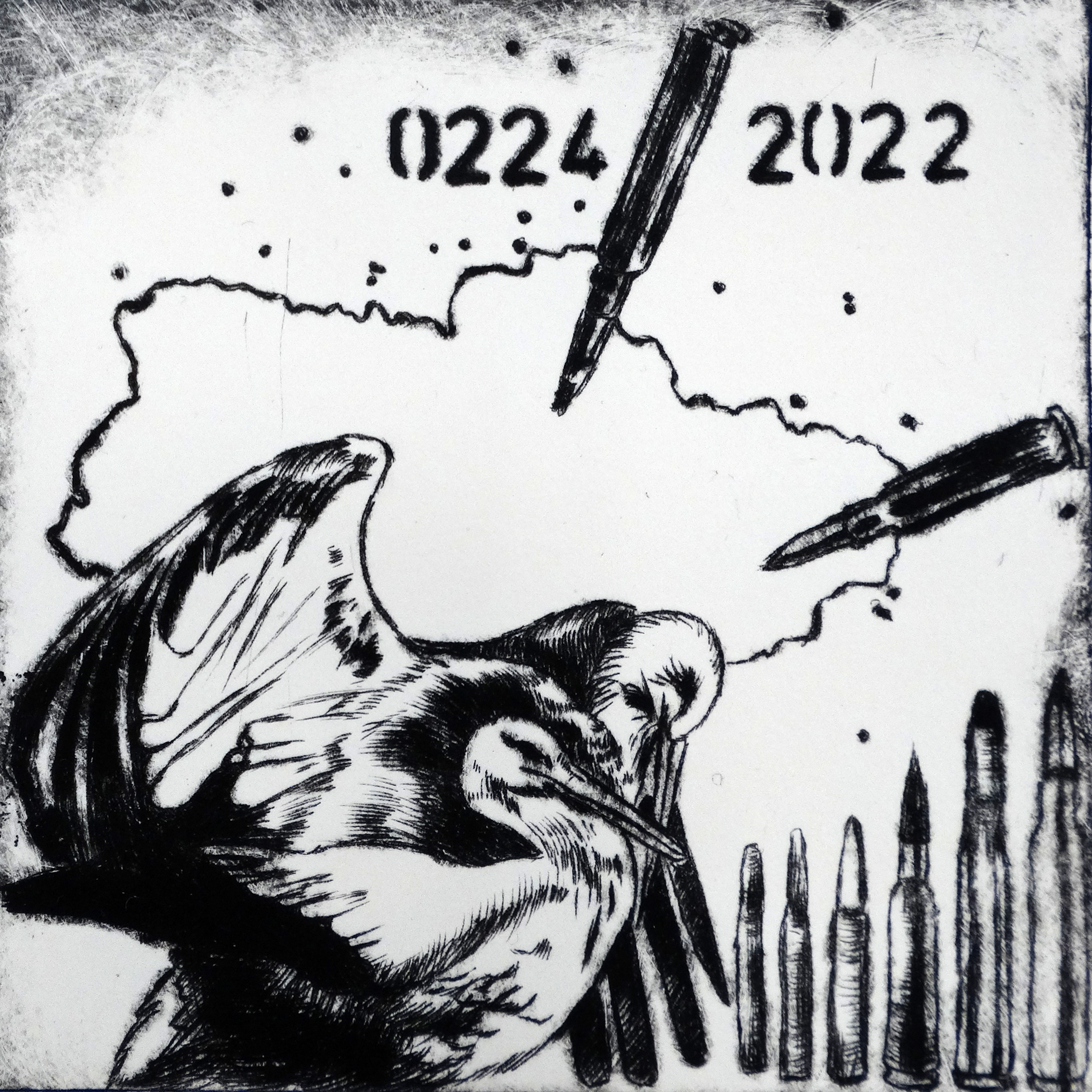 “‘Lanceāre’ serves as commentary in response to the February 24th, 2022 Russian invasion of Ukraine. The points populating the background of the image along with the linear shape symbolize the locations of the Russian troops encroaching on the boarders of Ukraine. The storks, representative of the national bird of Ukraine, represent the strength of the people standing together to protect one another while also seeking shelter from the violent onslaught brought forth by the Russian military.”