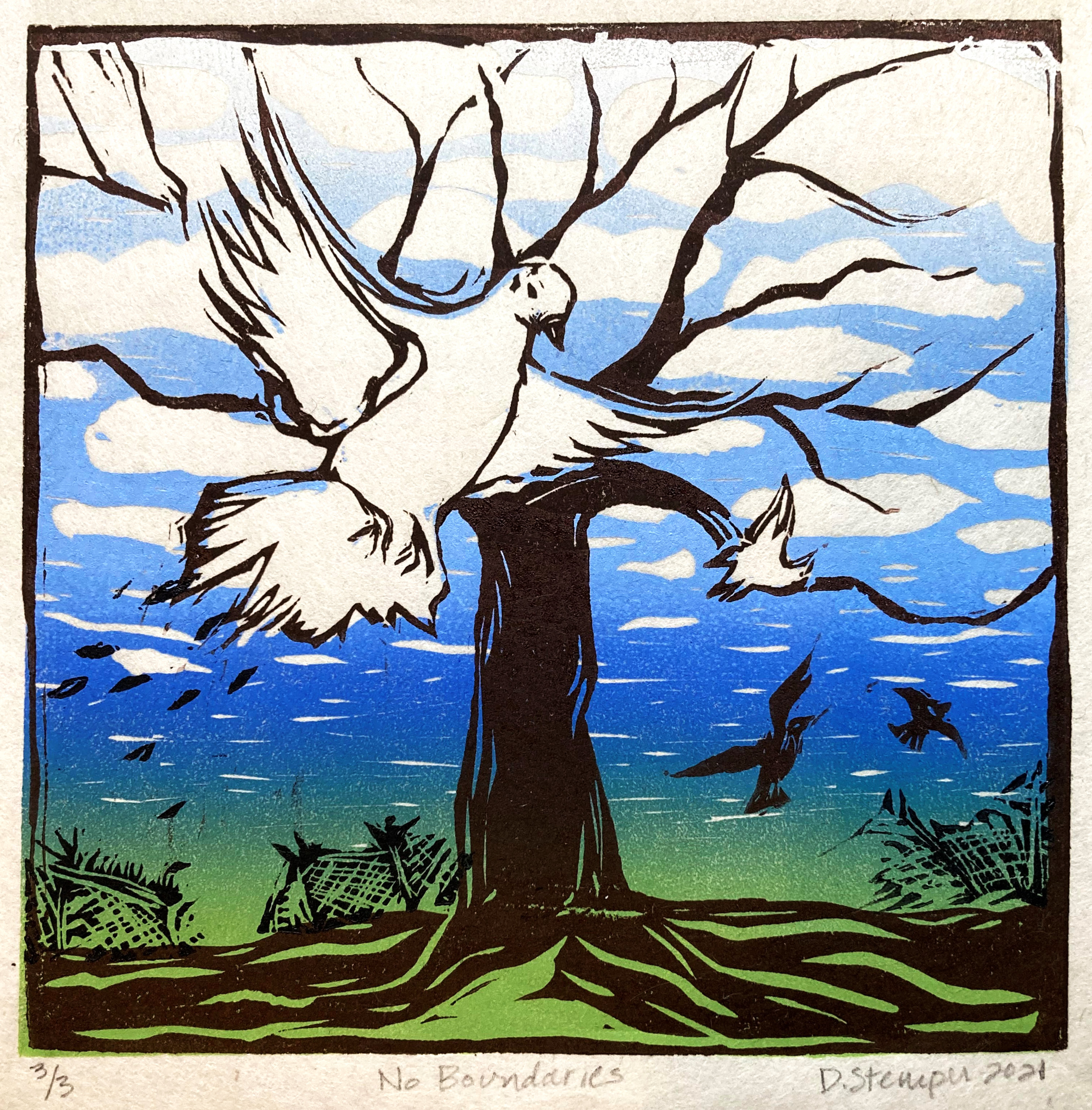“’No Boundaries’ reflects my concern with border issues and the difficulties of immigration and refugees seeking asylum. The symbol of peace, the Dove, is breaking free, breaking down the boundary that keeps one group of people from entering another group’s country. The print reflects my hope for immigration reform that treats all people with dignity.”
