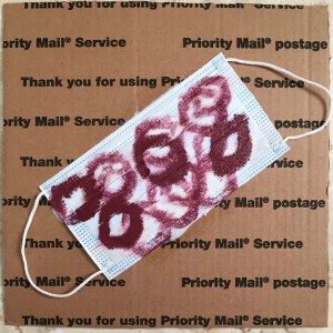 lipstick kiss monoprint on face mask and priority mail cardboard; 10×10” with accompanying poem