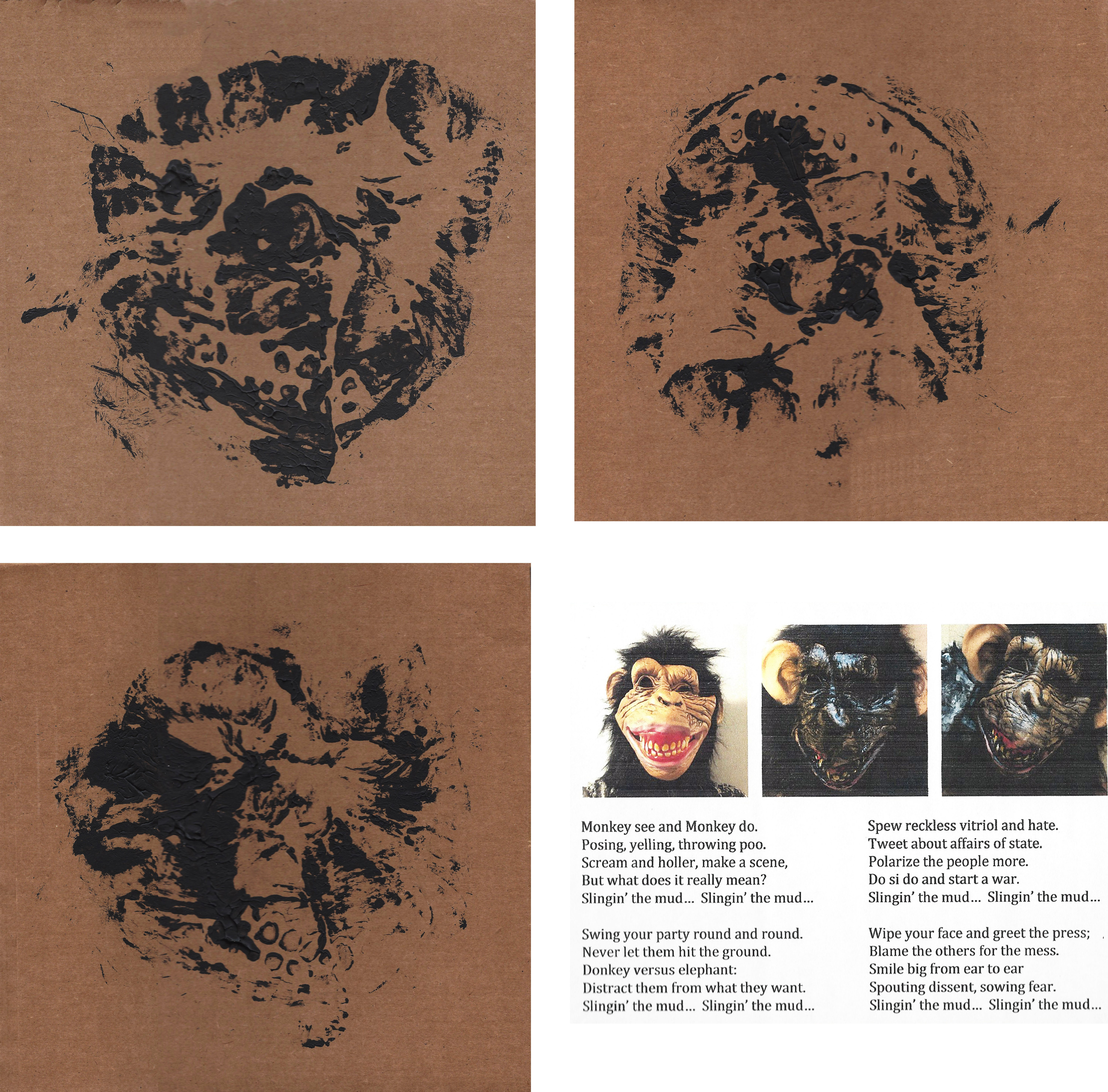 “These prints evidence a performative artwork in which I pressed the monkey mask to the cardboard to make an impression in acrylic paint. They are meant, with the accompanying poem, as a reflection on our current political climate.”